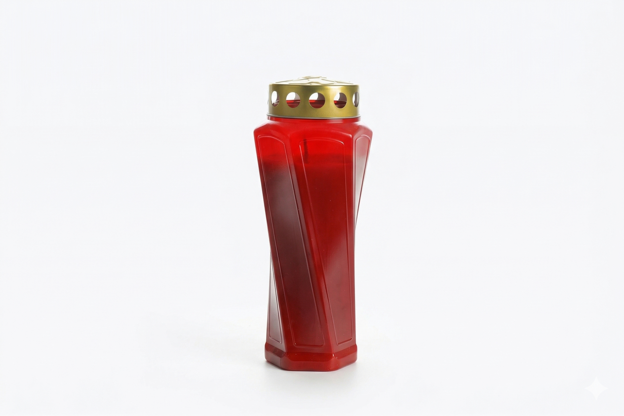 Candela din plastic SV-FIVE-R este un model clasic si practic, realizat din plastic rosu, cu forma inalta, fatetata si capac auriu ventilat. Produsul este destinat utilizarii memoriale si religioase, fiind potrivit pentru cimitir, comemorari, pomeniri si alte momente de reculegere.